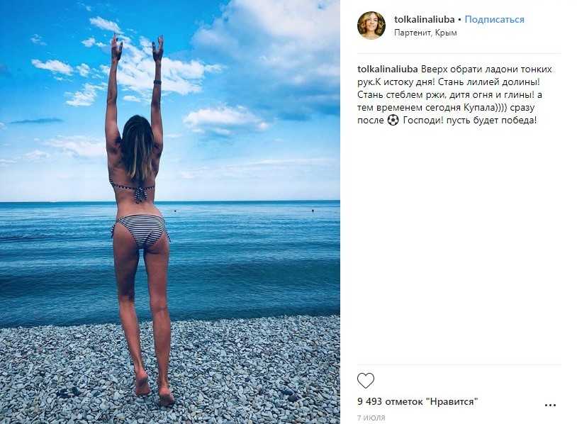 Своих поклонников она регулярно удивляет новыми фотосессиями. Одна из последних была сделана на острове Гоа. Там Толкалина отдыхала и занималась йогой. На фотографиях она появляется обнаженной, прикрывшись только одним шарфом.