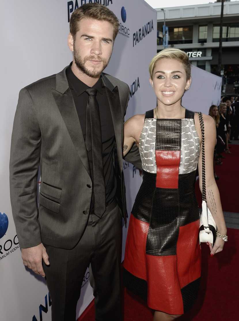 Лиам Хемсворт и Майли Сайрус на премьере фильма «Паранойя» (2013)