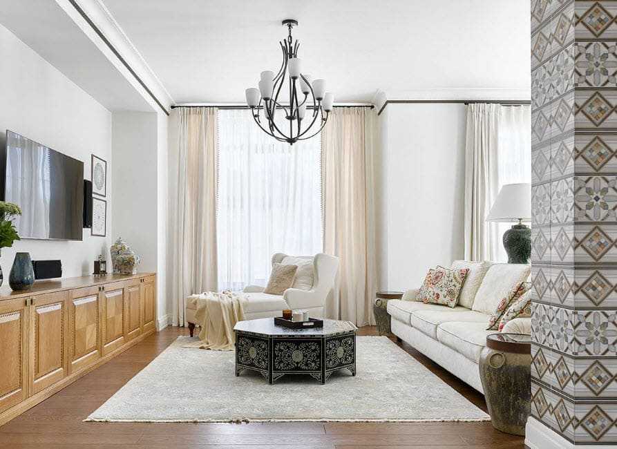 На стены поклеили обои под покраску и окрасили английской краской в бежевых тонах. На потолке смонтировали навесное полотно, а на пол уложили массивную доску молочного цвета. Межкомнатные двери заменили во всей квартире, а в гостиную установили двери специальной конструкции для небольших помещений.