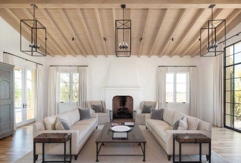 Первый этаж здания отведен под вместительную гостиную с большим камином, кухню, обеденную зону и технические комнаты. На втором этаже располагаются спальни хозяев и их детей, а также библиотека и кабинет, который в дальнейшем переделали под детскую комнату. В интерьере загородного особняка преобладает натуральное дерево. Все выполнено в теплых и выдержанных тонах. Деревья и кустарники высажены по периметру, газон возле дома коротко подстрижен.