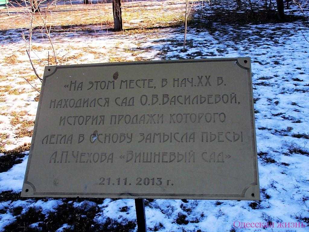 Подходим к потускневшей от времени табличке на бульваре Жванецкого, которая извещает: «На этом месте, в начале ХХ века находился сад О.Р. Васильевой, история продажи которого легла в основу замысла пьесы А. П. Чехова «Вишневый сад».