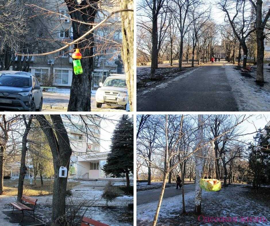 Еще одной приметой бульвара стало появление здесь птичьих кормушек и домиков — в богатейшем разнообразии. Ветки просто увешаны ими, некоторые даже украшены елочными игрушками. Кормушки никогда не бывают пустыми.
