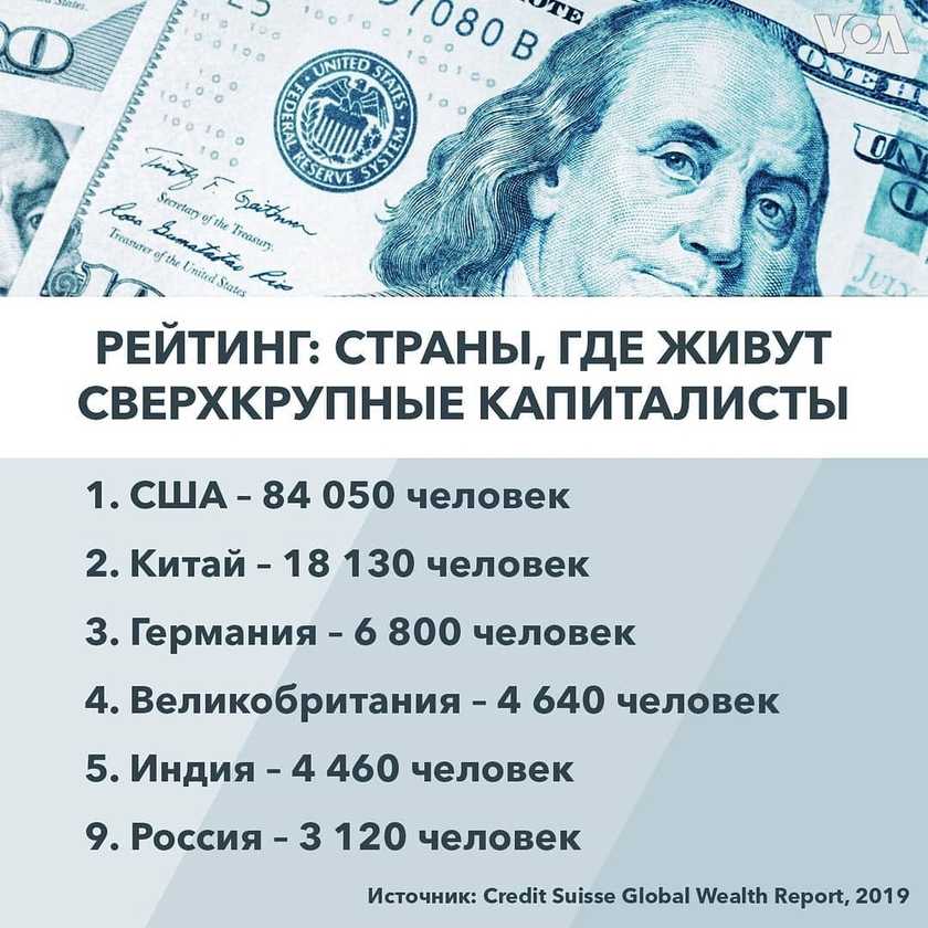 Швейцарский финансовый конгломерат «Кредит Суисс груп» (Credit Suisse) пересчитал количество человек в мире, обладающих сверхкрупным – не менее $50 млн – чистым капиталом в 2019. Эти данные приводятся в ежегодном отчете финансового гиганта. В топ-10 стран попали США, Китай и Россия.