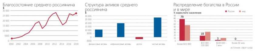 Финансовые активы взрослого россиянина составляют в среднем $10 570, нефинансовые – $19 530. При этом задолженность домохозяйств составляет 9% общих активов.