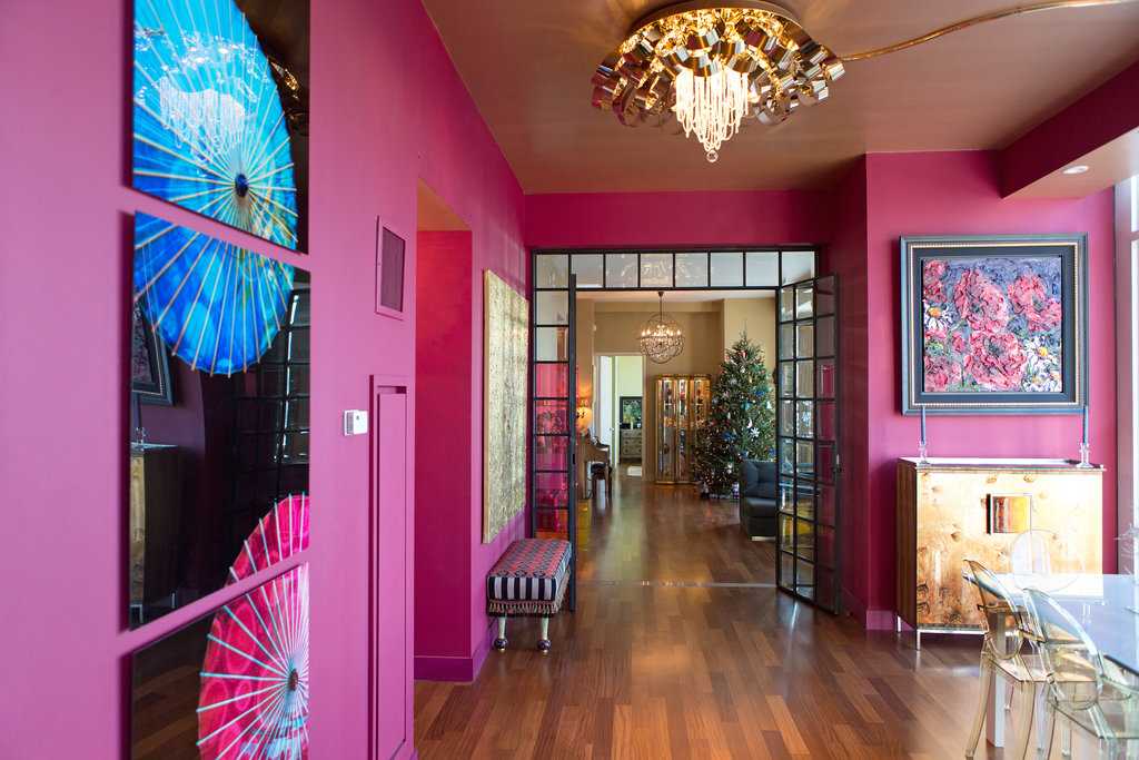 В коридоре темно-синего цвета установлено красивое трюмо из массива дерева, на нем стоят вазы с живыми цветами. Розовый холл соединяет столовую зону с гостиной. На стенах висят яркие картины, которые певица привезла из Японии.
