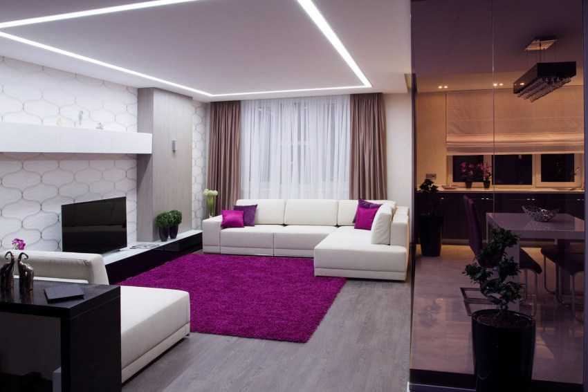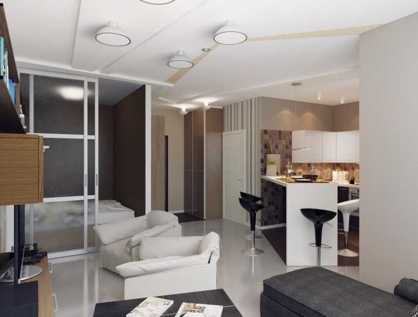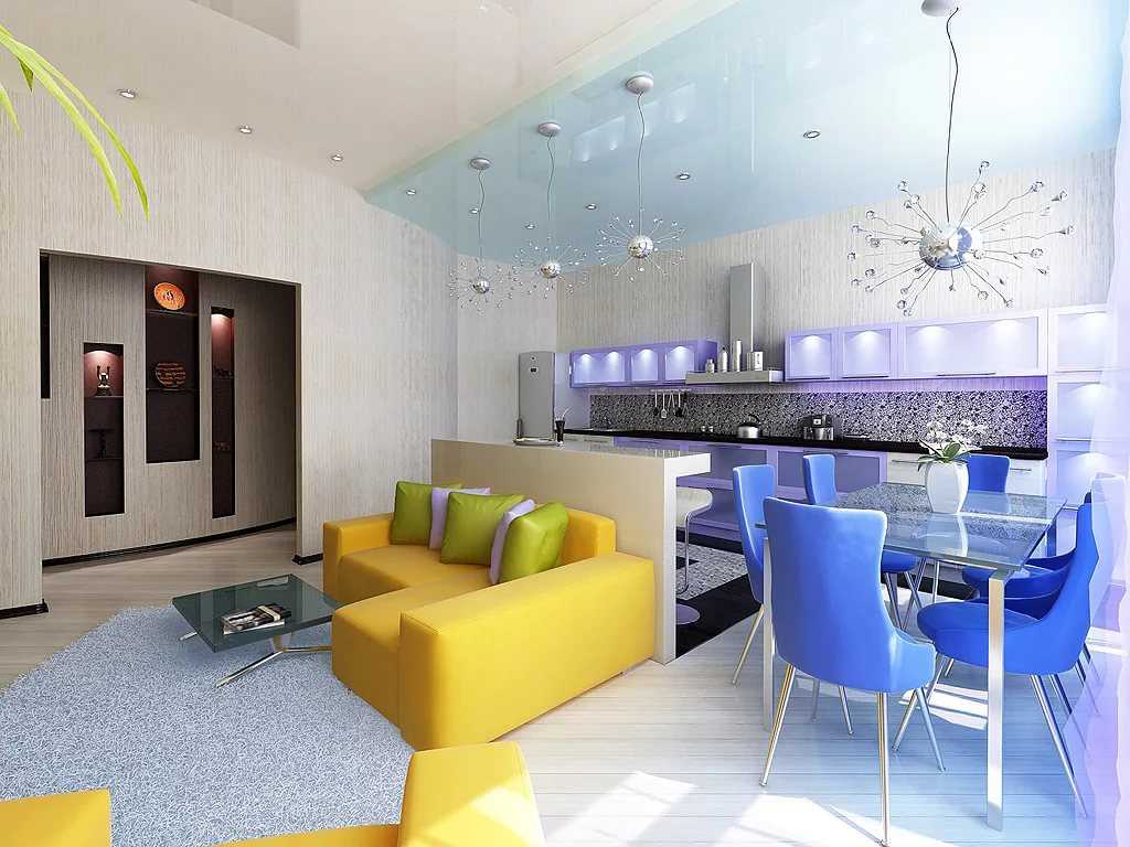 визуальные способы зонирования. Самые основные из них – это световые эффекты (установка осветительных приборов, которые отличаются интенсивностью освещения, цветом, яркостью и другими параметрами), экспериментирование с уровнями пола и потолка. Также отличным примером визуального зонирования можно назвать установку барной стойки. Она как бы не изолирует одну зону от другой, однако четко очерчивает границы.