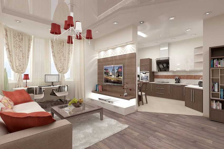 Если ваша квартира позволяет снести максимум перегородок, то подчеркнуть функциональность каждой зоны поможет разное напольное покрытие: кухонной зоне отлично подойдет плитка, а гостиной и спальне – паркет или ламинат. Тип и уровень освещения также подчеркнут необходимые отличия.