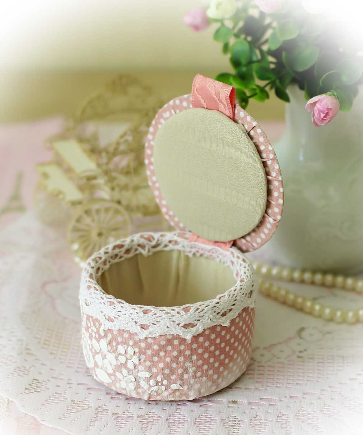 Можно также воспользоваться уплотненным картоном с оболочкой из ткани. Подобная шкатулка с крышкой также будет обладать привлекательным внешним видом и подойдет для хранения драгоценностей. Крышка дублируется синтепоном.