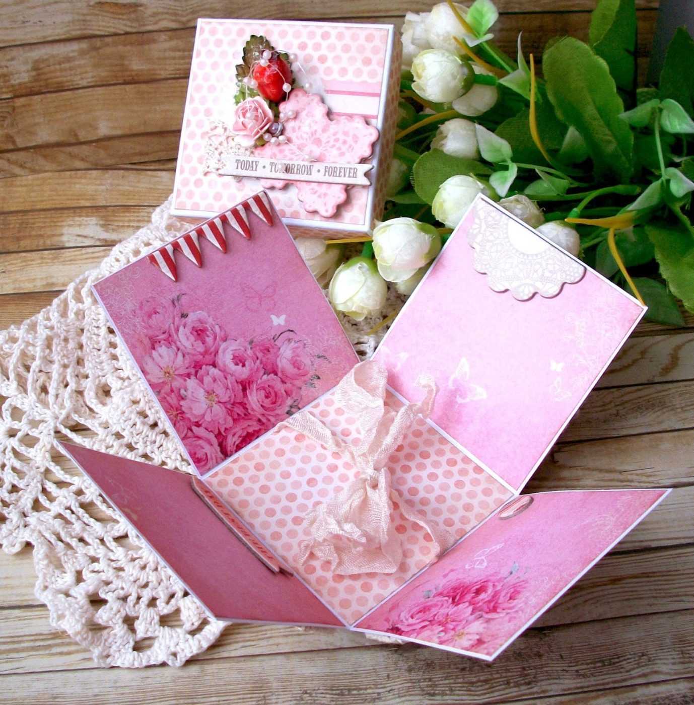 Существует несколько вариантов, как сделать коробочку с фотографиями своими руками, самый необычный, это когда составляющие вкладываются одна в другую по принципу матрешки. Этот способ достаточно трудоемкий и затратный по времени, однако восторг, который вызовет сюрприз, компенсирует все затраты.