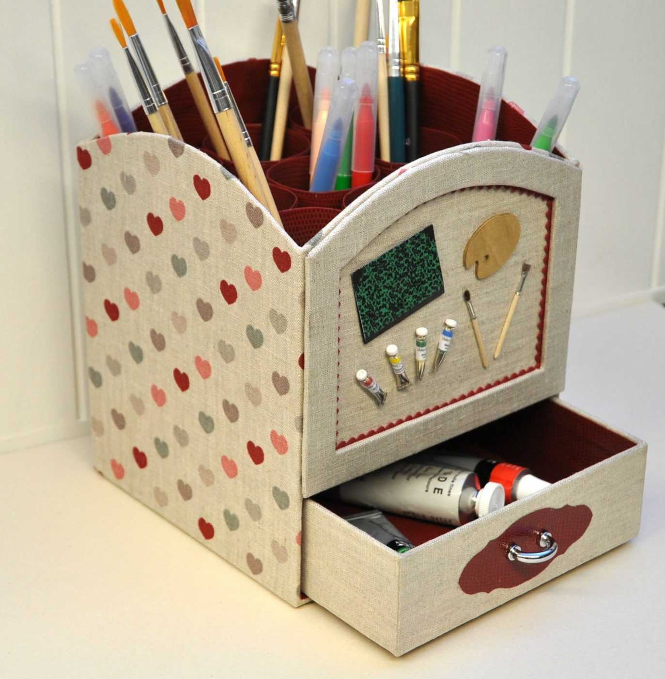 При декорировании подручного органайзера необходимо учитывать интерьер комнаты, где будет стоять коробка