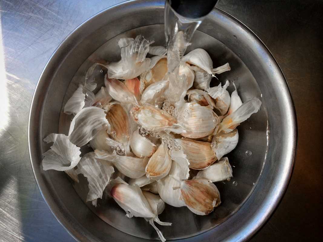 В огнеупорную емкость вливают воду и добавляют шелуху от чеснока без ограничений. Сюда же опускают столовые приборы и другие предметы из мельхиора. Емкость помещают на плиту и кипятят до тех пор, пока чернота не уйдет.