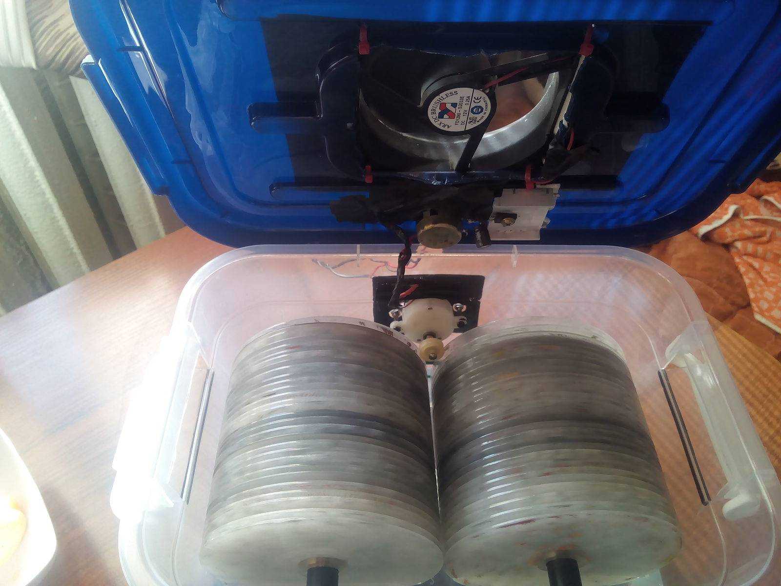 Заключительным этапом является установка на самом верху прибора компьютерного кулера, который будет воздействовать на влажный керамзит, обеспечивая попадание воздуха на его стенки.