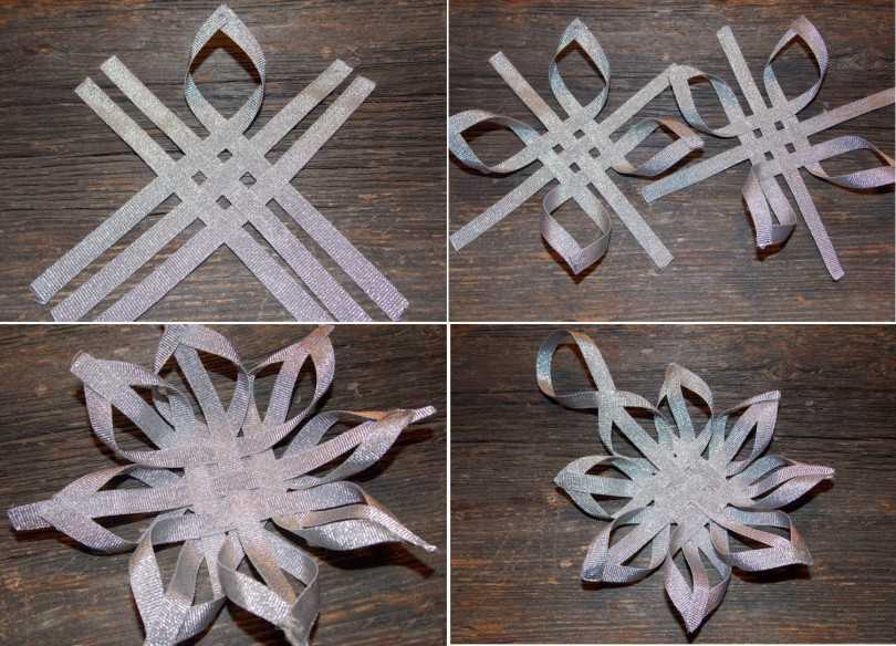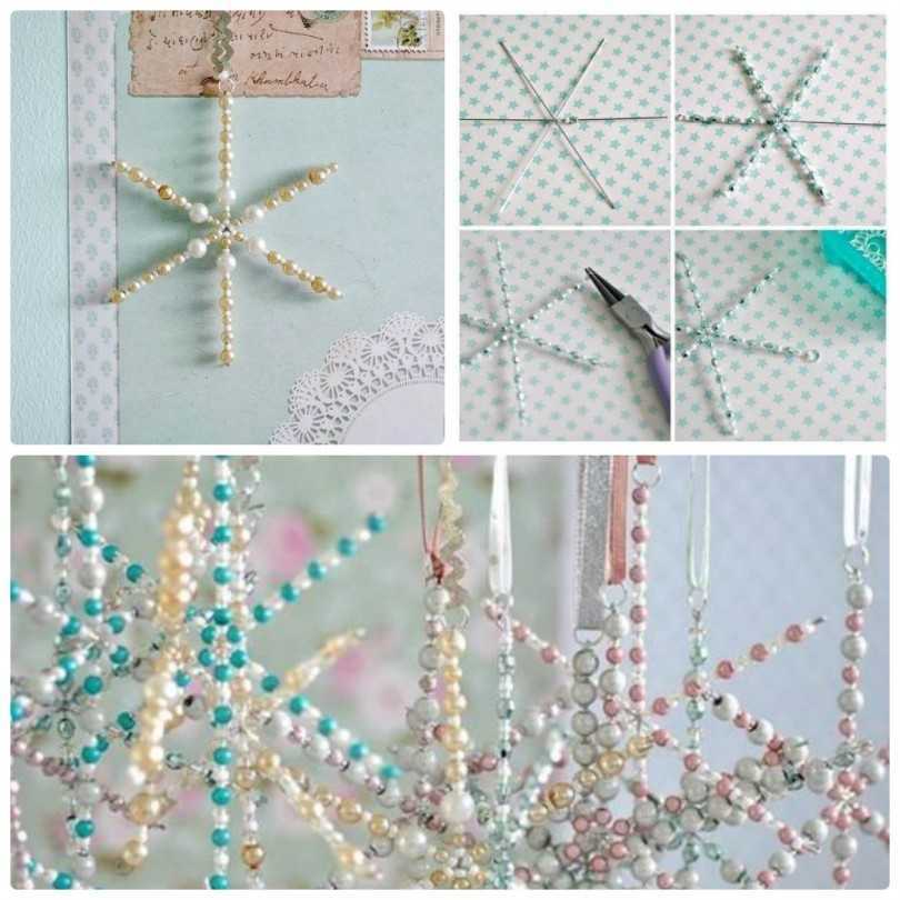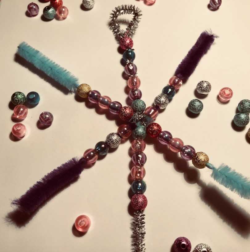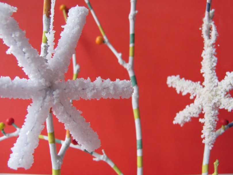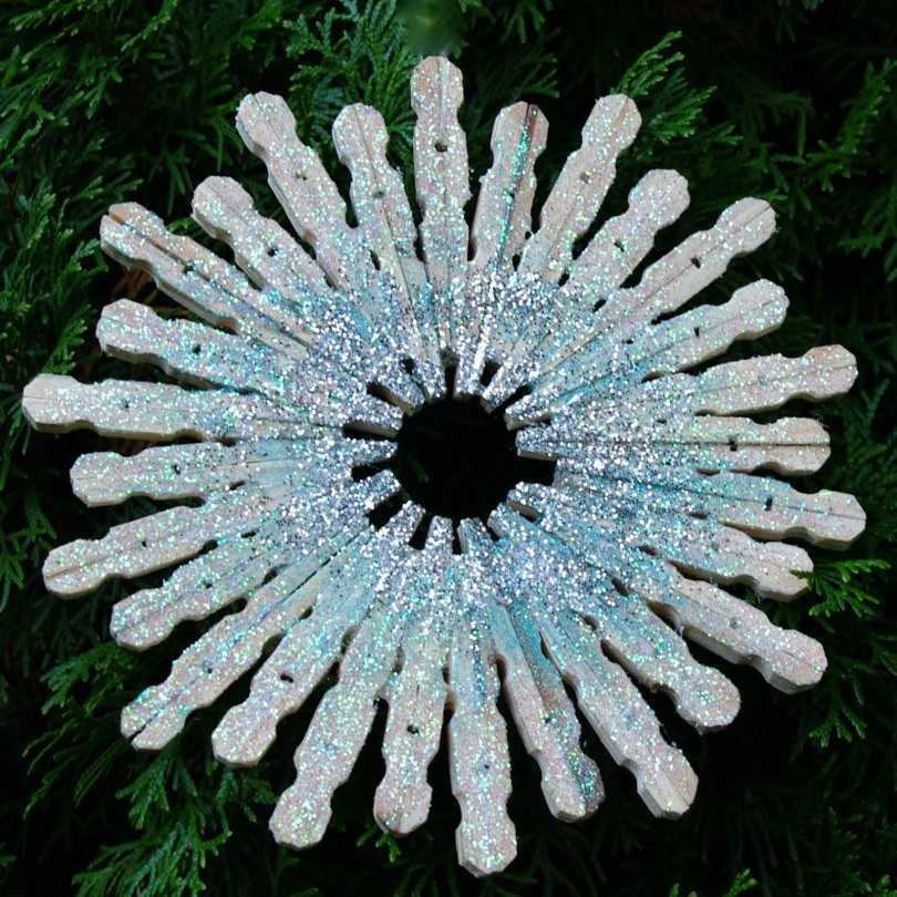 Кристально белые или красочные снежинки можно смастерить из самых неожиданных материалов. Прекрасной идеей новогодних поделок являются изделия из макарон различных размеров и форм. Скрепить их можно «Моментом» или ПВА, предварительно окрасив акрилом.