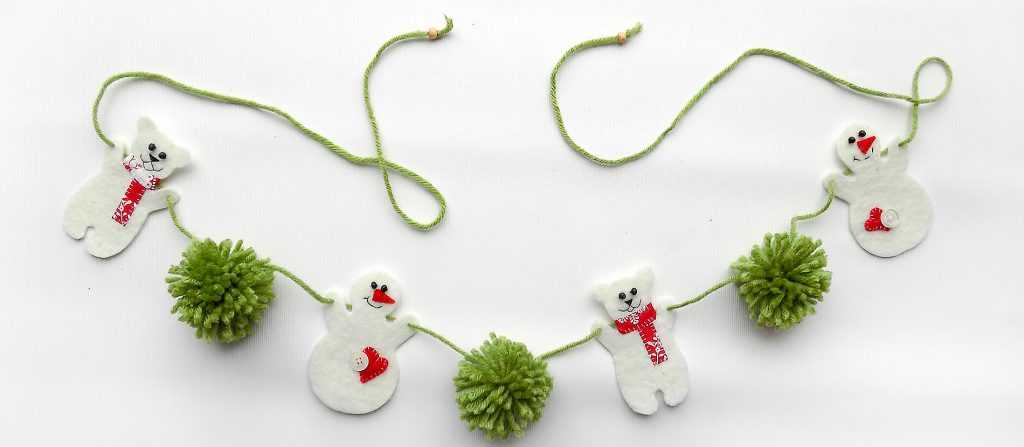 Для этой гирлянды понадобятся ватные диски, цветная бумага, ножницы, клей, прочная белая нить. Изделие называется «Весёлые снеговики». Суть заключается в изготовлении мордашек этих снеговиков.