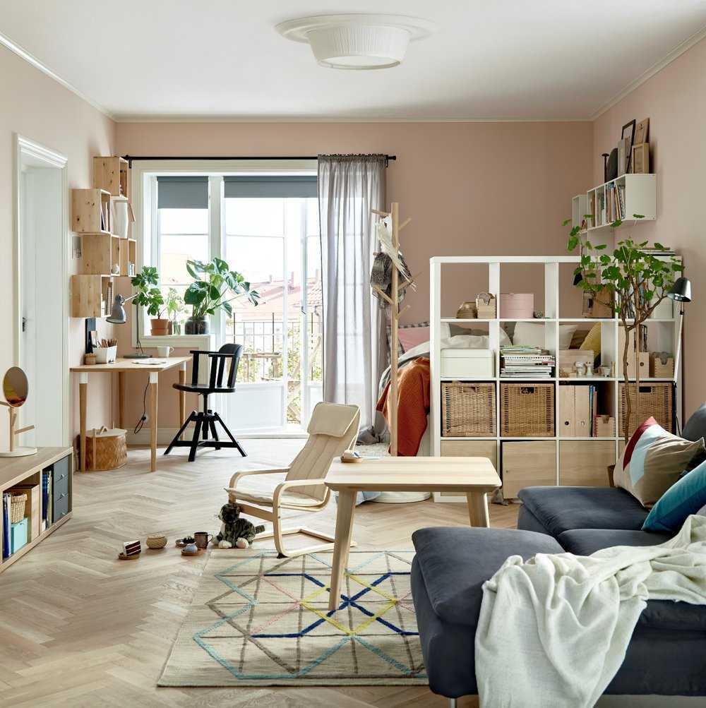 Зонирование такого помещения обычно условное – с помощью сквозного стеллажа, журнального столика или спинки дивана.