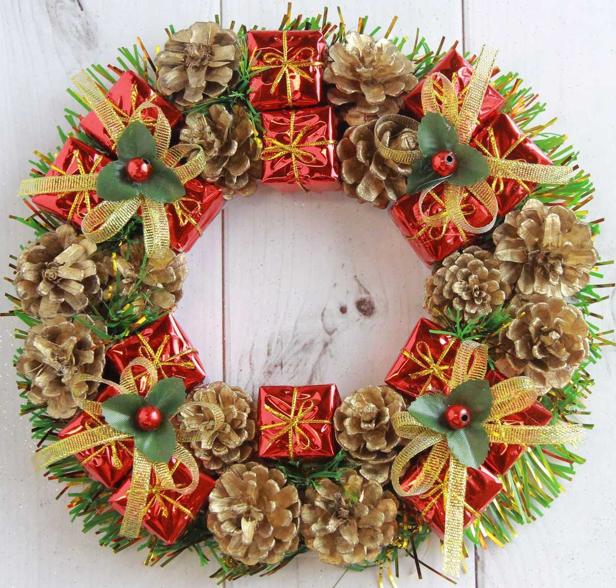 Вот в этой мы видим шишки и другие искусственные фрукты. Оказывается венок сплели из обычной газеты, а после просто спрятали его в органзу и обмотали мишурой.