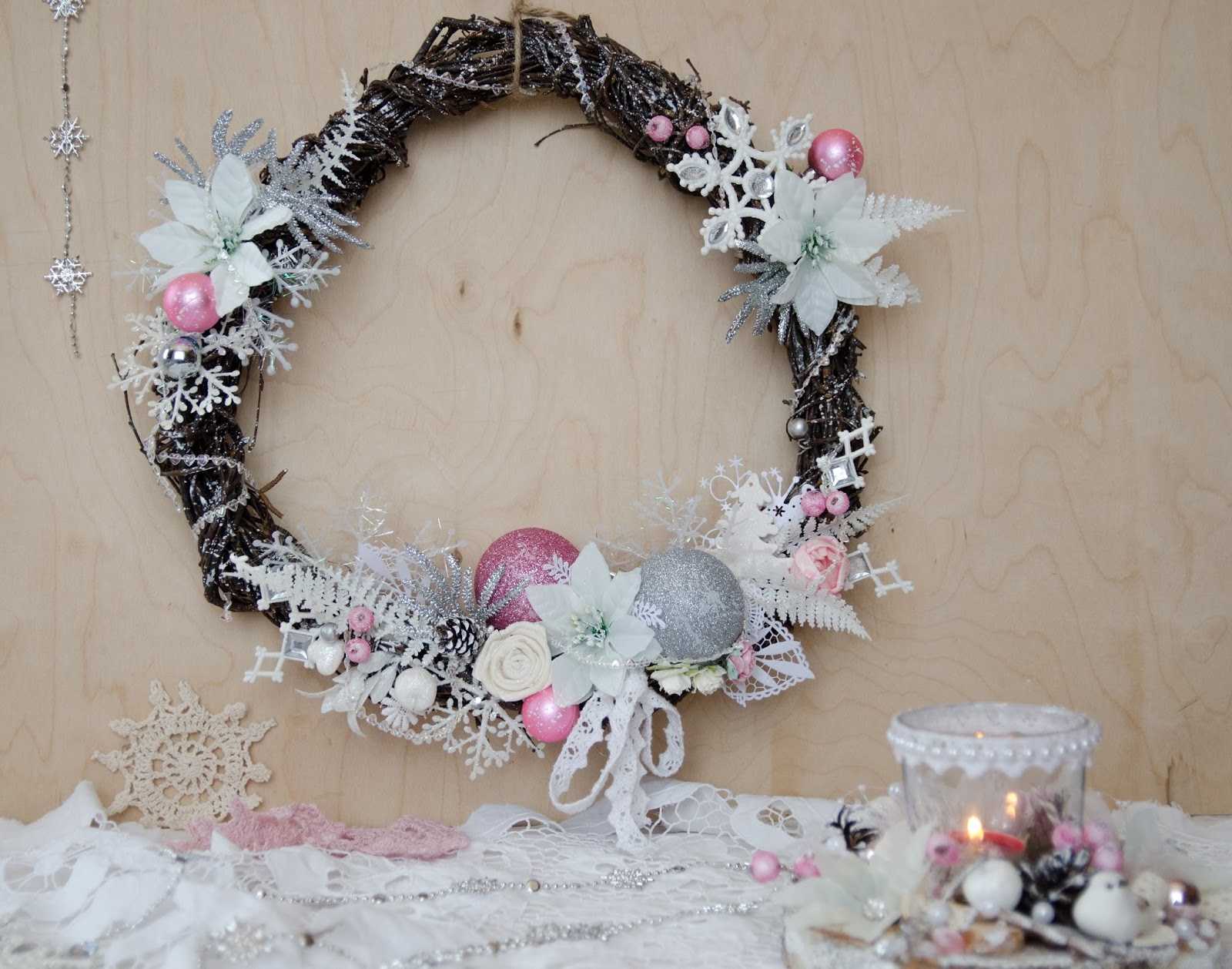 Кроме этого, вы можете использовать свечки, правда тогда в таком случае венок нельзя будет подвесить, а просто положить на стол и использовать в виде подсвечника.