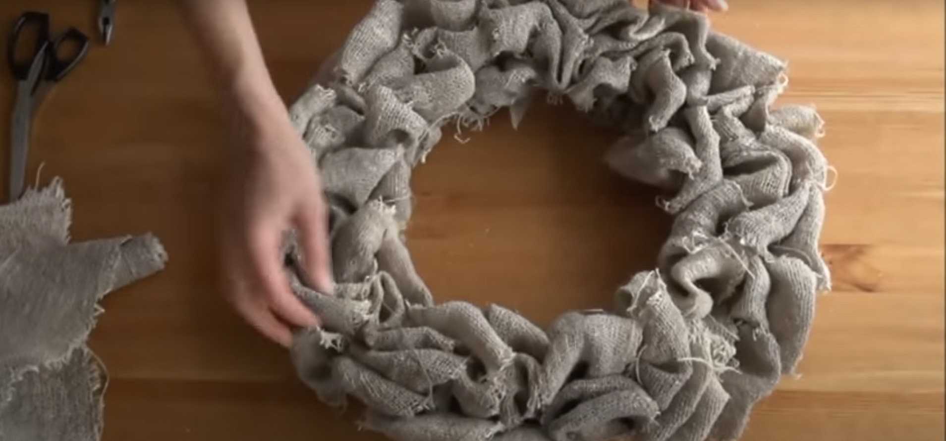 - 14. Когда венок будет полностью оплетен, отрежьте оставшуюся мешковину. Край ленты зафиксируйте с обратной стороны каркаса.