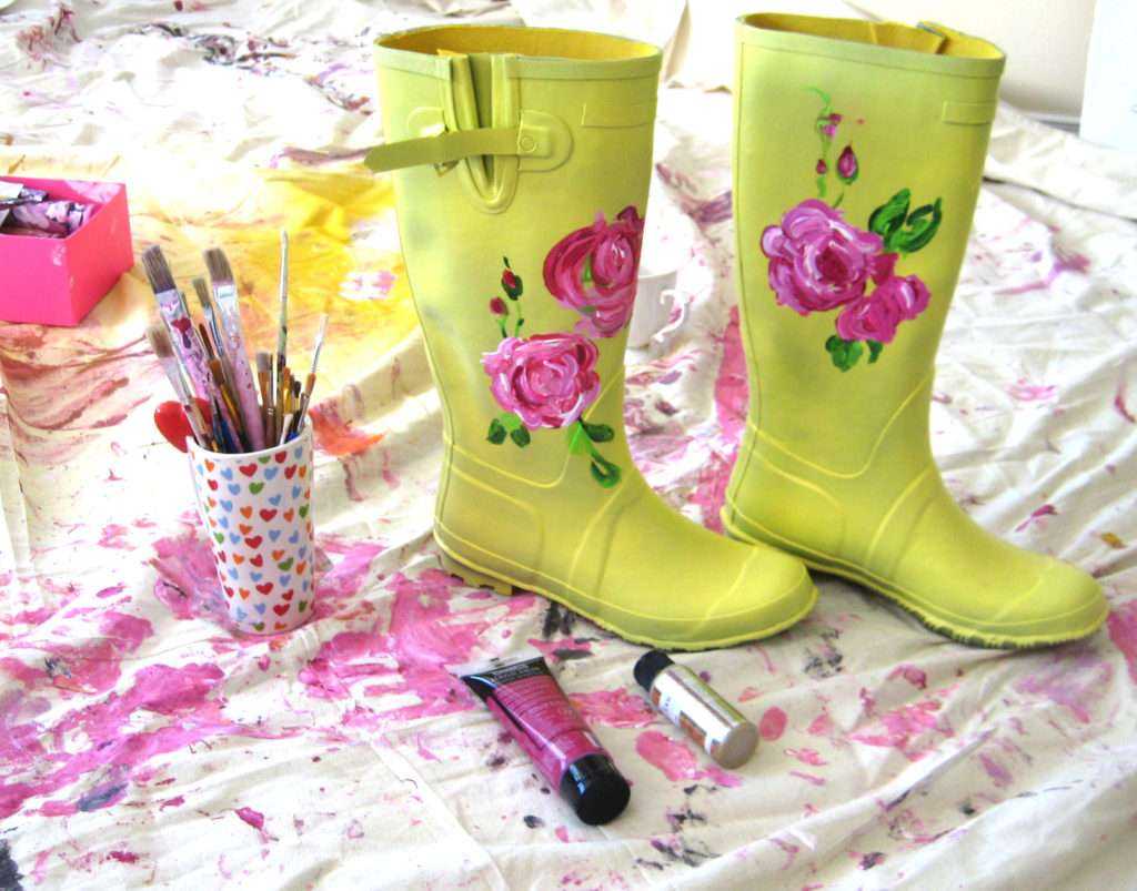 Перед покраской достаточно вымыть обувь мыльным раствором и хорошо просушить. Спиртовой очиститель губительно скажется на состоянии резины, поэтому его лучше не использовать. Если нужно нанести рисунок, стоит воспользоваться трафаретом. Резиновую обувь после покраски необходимо сушить несколько дней.