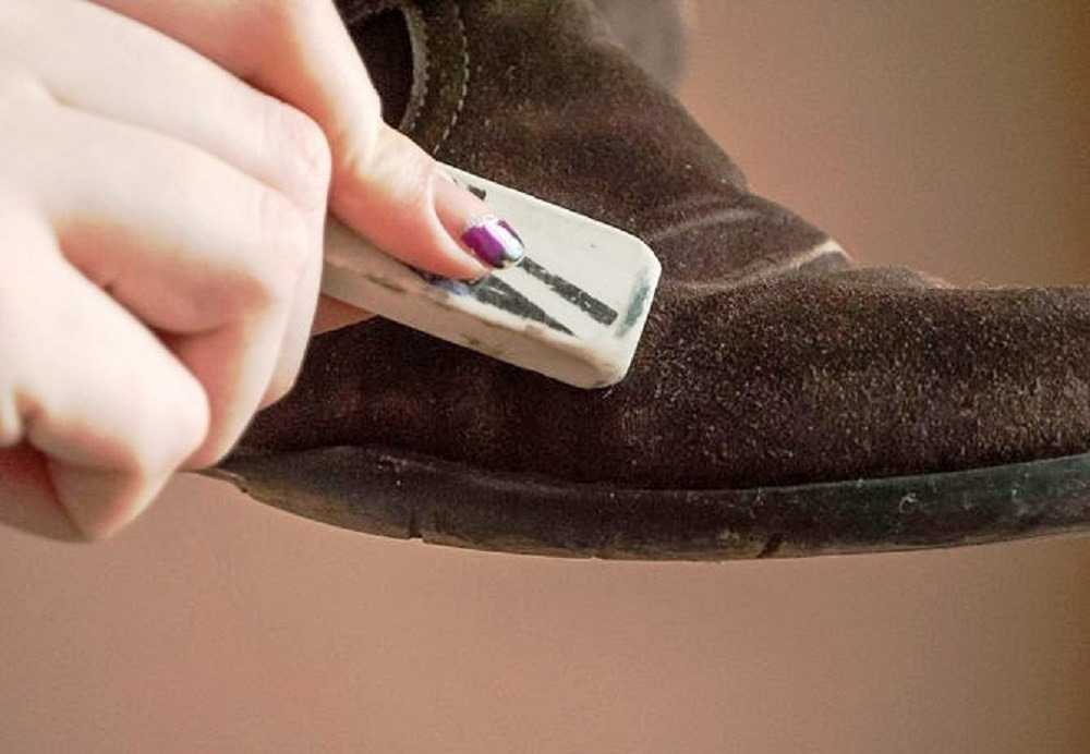 - Ластик. Специальная щетка в виде ластика позволяет избавиться от разводов. Сначала поверхность обрабатывается гладкой стороной щетки. Затем используют мягкую часть, позволяющую зашлифовать загрязнения, устраняя разводы. Если обувного ластика под рукой нет, можно попробовать заменить его школьной стеркой. Лучше выбирать светлую. Нужно натереть ей изделие, а затем подержать обувь несколько минут над горячим паром. Не стоит опускать изделие слишком низко. Горячий пар позволяет приподнять ворс;