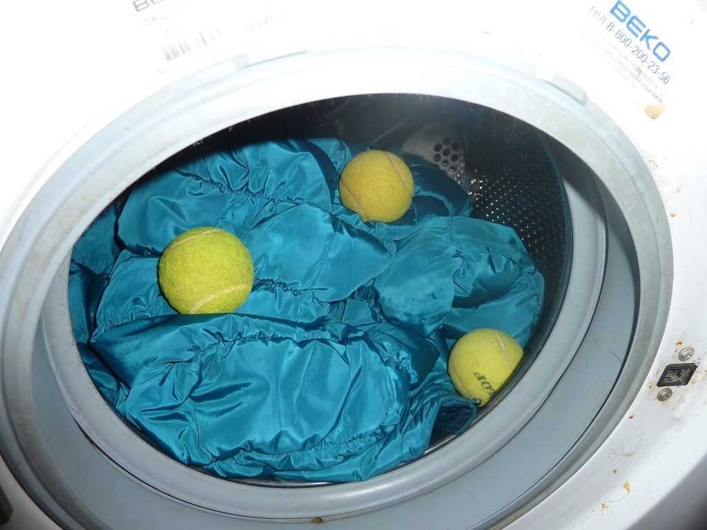 Чтобы пух не сбивался в комки, рекомендуется добавить в барабан стиральной машинки 2-4 специальных мячика для стирки. Это могут быть либо теннисные мячи, либо резиновые или силиконовые шарики (продаются в хозяйственных магазинах). По одному мячу необходимо положить в боковые карманы пуховика, ещё пару – просто закинуть в барабан машинки-автомата вместе с пуховиком, перед началом стирки. Они будут дополнительно воздействовать на изделие, разбивая пуховые комки.