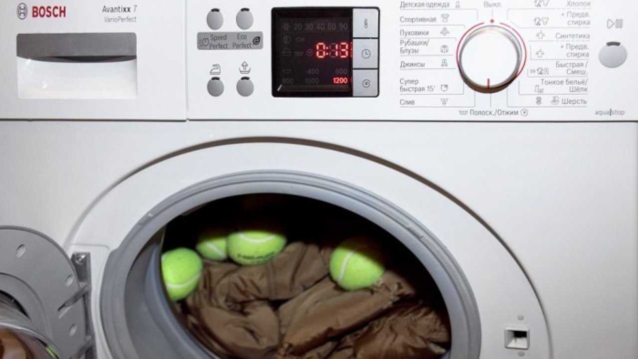 При стирке пуховика в домашних условиях есть один секрет, помогающий гарантированно сохранить красивый внешний вид и функциональность изделия. Добавьте в барабан три теннисных мячика для предотвращения образования комков пуха.