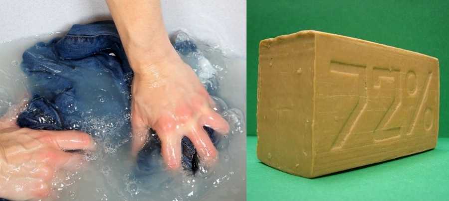 Хозяйственное мыло. С джинсов необходимо удалить верхний слой загрязнения, после чего их следует намылить хозяйственным мылом. Оставить на некоторое время в воде, затем постирать с порошком.