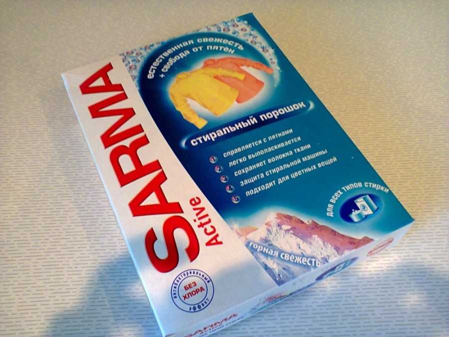 «Сарма Актив» — удобное средство в виде порошка, смешивается с водой и наносится на пятно.