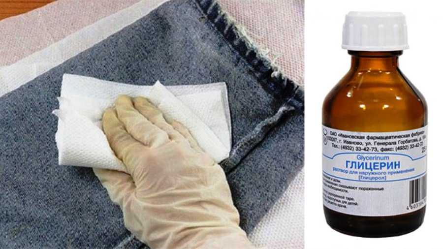 Глицерин. От засохшей краски помогает избавиться прогретый глицерин. Он размягчает пятно, позволяя без проблем отстирать его. Обычно на это уходит 5-10 минут. Завершающим этапом будет нанесение медицинского спирта, после чего джинсы необходимо прополоскать в воде.