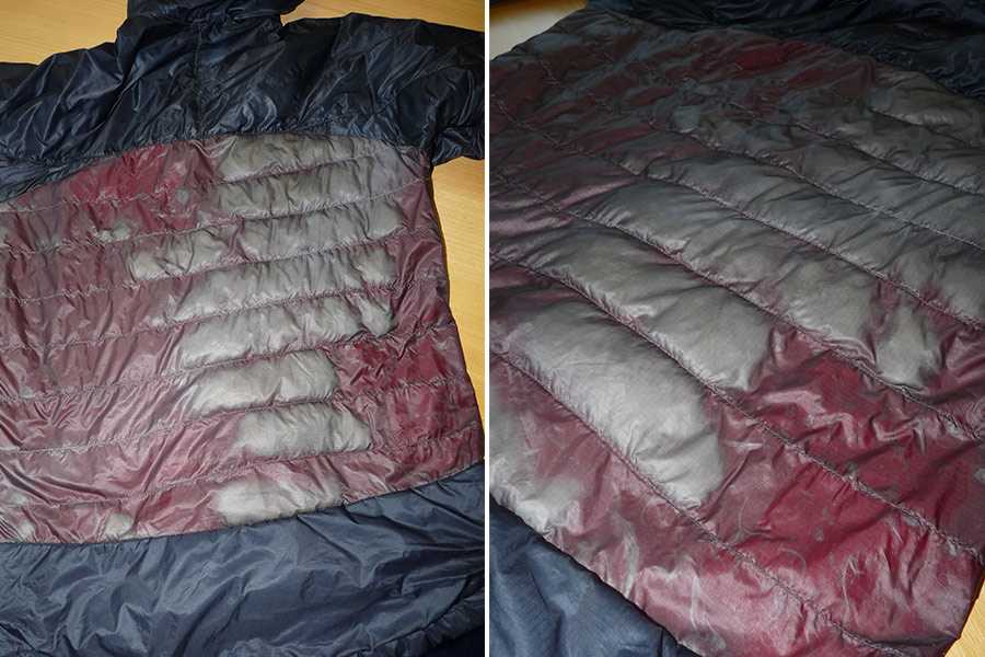 - темные разводы. Такие пятна могут свидетельствовать о нахождении пуховика во влажном или мокром виде продолжительное время либо же была сделана неправильная сушка.