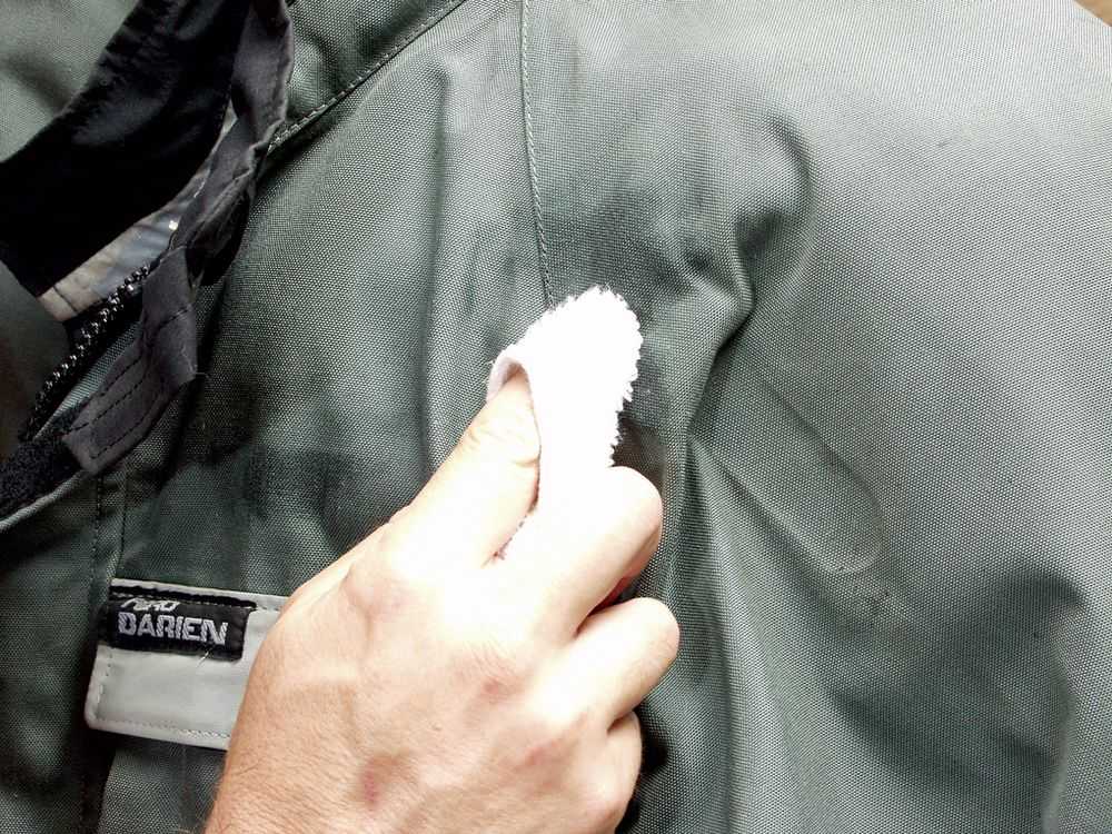 - Губкой или мягкой щёткой нанесите пену на куртку, оставьте на 30 мин.