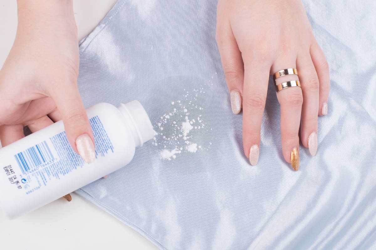 Данный метод стоит применять только в том случае, когда вещь нельзя стирать руками. Тальк, крахмал или детскую присыпку нужно нанести на место загрязнения и потихоньку втереть. Далее стоит оставить вещь в покое на 10-20 минут. После необходимо аккуратно влажной салфеткой снять слой, который был нанесен. Лучше всего его использовать на белых вещах. При использовании имеется риск обесцветить вещь. Чтобы этого не произошло все следует делать очень аккуратно.